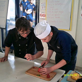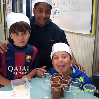 Côté papille d’abord. Dans le club-house transformé en vraie cuisine de restaurant, c’est l’excitation ! Une armée de petits marmitons, toque sur la tête ont, épluché, coupé, étalé, délayé, démoulé, décoré en suivant les consignes de Sonia Marchand, animatrice de l’atelier. Il fallait bien l’énergie du collectif pour fabriquer tous ces clafoutis, fondants aux chocolats, tuiles de carambar, baguette de pain, salade de fruits. Une fois le programme culinaire de la matinée affiché et les conseils délivrés, les petites mains s’activaient dans les saladiers et sur les planches à découper. Paula, Darko, Artiom, Alexandre et les autres… tous ont composé eux-mêmes leurs pizzas, deux chacun histoire de régaler aussi les potes de l’atelier musique. C’est en toute liberté qu’ils ont nappé puis décoré les pâtisseries. Faire soi-même, faire ensemble. Pari réussi ! Sonia. ex-restauratrice a su imaginer en effet, des plats simples et bons, réalisés à partir de produits sains. Des recettes faciles à refaire à la maison.